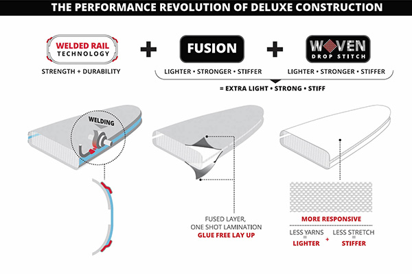 De Fusion Woven dropstitch maakt de Deluxe boards extra sterk en stijf. De Heat Welded rails maakt hem luchtdichte en nog sterker en stijver. De Galvanized 2000D rails versterkt ook weer het board.